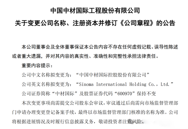 近日,中國中材國際工程股份有限公司發(fā)布公告,擬對公司名稱進行重大調(diào)整。根據(jù)公告,中材國際擬將名稱由中國中材國際工程股份有限公司變更為中國中材國際控股股份有限公司,英文名稱同步相應調(diào)整,公司證券簡稱及股票代碼保持不變。本次事項已經(jīng)相關會議審議通過,尚需完成市場監(jiān)管部門核準登記等程序后方可正式實施。