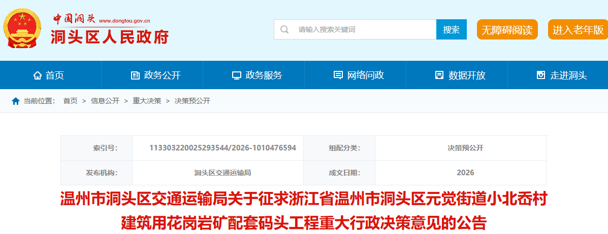 近日,浙江省溫州市洞頭區(qū)人民政府網(wǎng)站發(fā)布《溫州市洞頭區(qū)交通運輸局關(guān)于征求浙江省溫州市洞頭區(qū)元覺街道小北岙村建筑用花崗巖礦配套碼頭工程重大行政決策意見的公告》。