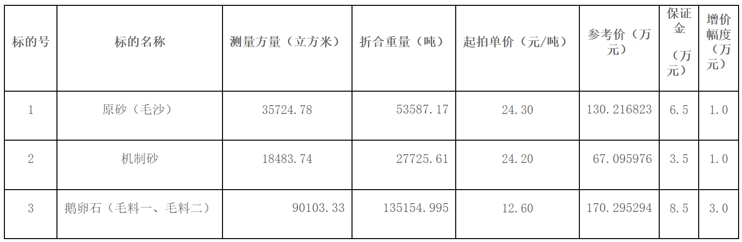 測量方量35724.78立方米(折合重量53587.17噸),起拍單價24.3元/噸,參考價130.216823萬元。