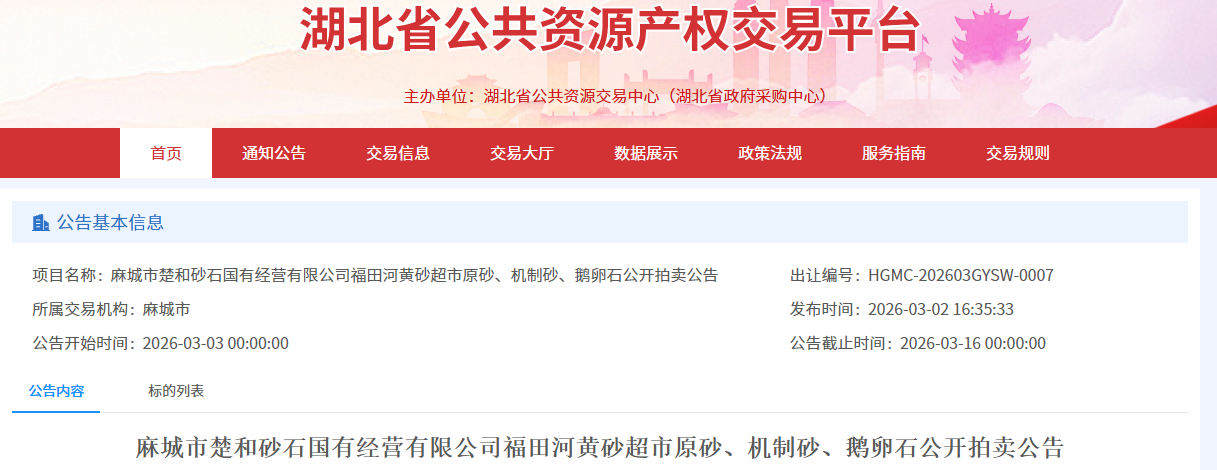 近日,湖北省公共資源產(chǎn)權(quán)交易平臺發(fā)布《麻城市楚和砂石國有經(jīng)營有限公司福田河黃砂超市原砂、機制砂、鵝卵石公開拍賣公告》。本次拍賣時間為2026年3月17日9時。詳情如下: