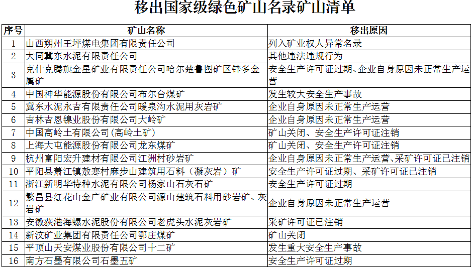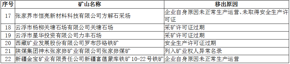 以下為22家被移出礦山的詳細信息,按序號整理,明確標注礦山名稱及移出原因,方便大家快速查閱: