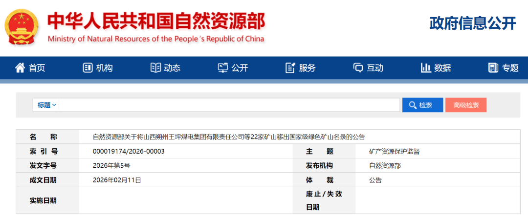 2月11日,自然資源部發(fā)布公告,根據(jù)相關(guān)管理規(guī)定,決定將山西朔州王坪煤電集團有限責(zé)任公司等22家礦山,移出國家級綠色礦山名錄。此次移出涉及多個省份、多類礦種,背后均存在明確違規(guī)或異常情形,值得行業(yè)重點關(guān)注。