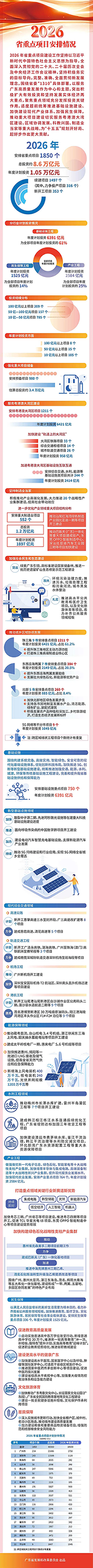 2026年,廣東省以高質(zhì)量發(fā)展為核心,錨定 “制造業(yè)當(dāng)家”“粵港澳大灣區(qū)建設(shè)” 等重大戰(zhàn)略,重磅發(fā)布全省重點(diǎn)項(xiàng)目建設(shè)計(jì)劃。全年共安排省重點(diǎn)項(xiàng)目1850個(gè),項(xiàng)目總投資約8.6萬(wàn)億元,2026年度計(jì)劃完成投資1.05萬(wàn)億元;同步安排預(yù)備項(xiàng)目980個(gè),估算總投資約3.4萬(wàn)億元,為全省持續(xù)發(fā)展筑牢堅(jiān)實(shí)項(xiàng)目?jī)?chǔ)備。