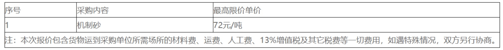 據(jù)悉,本項目為機制砂采購選取供應(yīng)商,機制砂最高限價72元/噸。