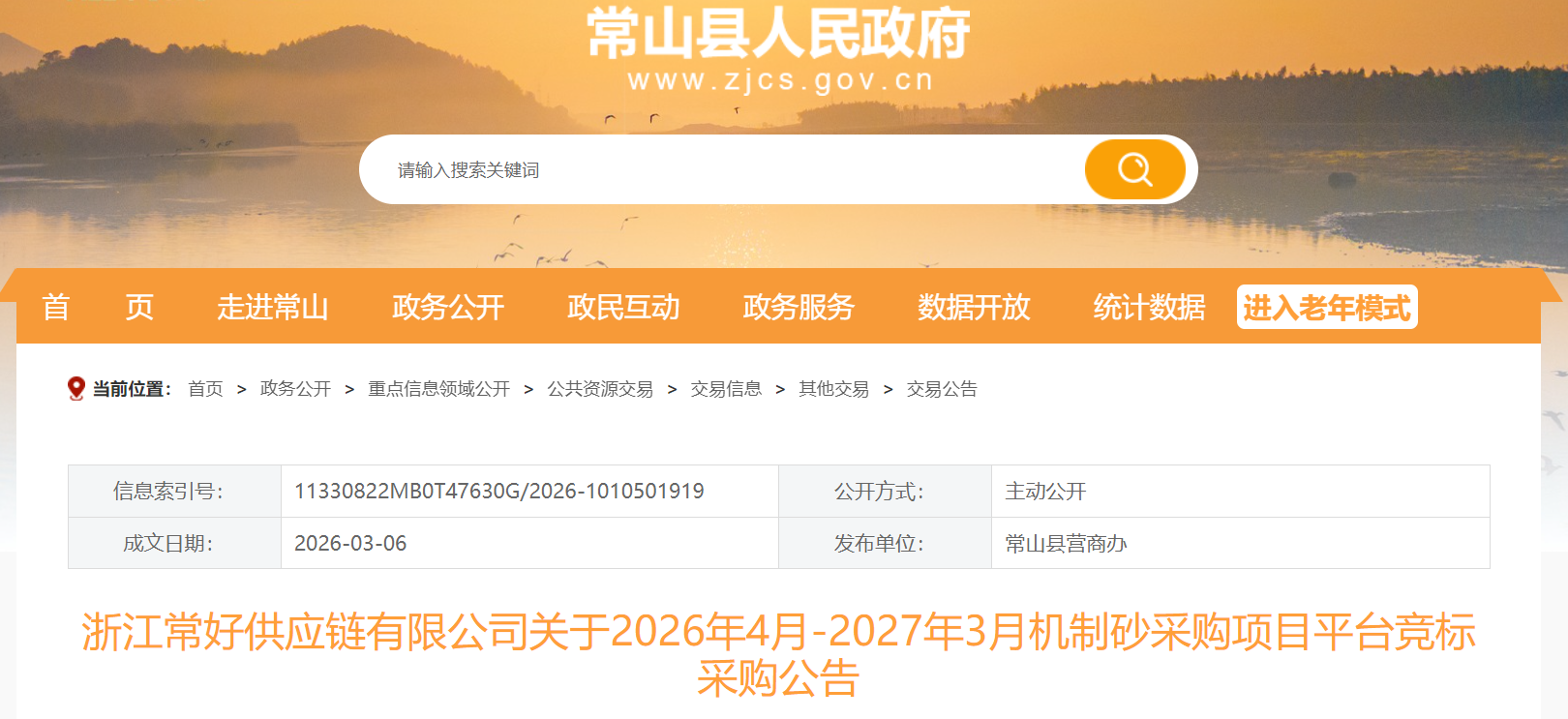 日前,浙江衢州市常山縣政府發(fā)布《浙江常好供應(yīng)鏈有限公司關(guān)于2026年4月-2027年3月機制砂采購項目平臺競標采購公告》。