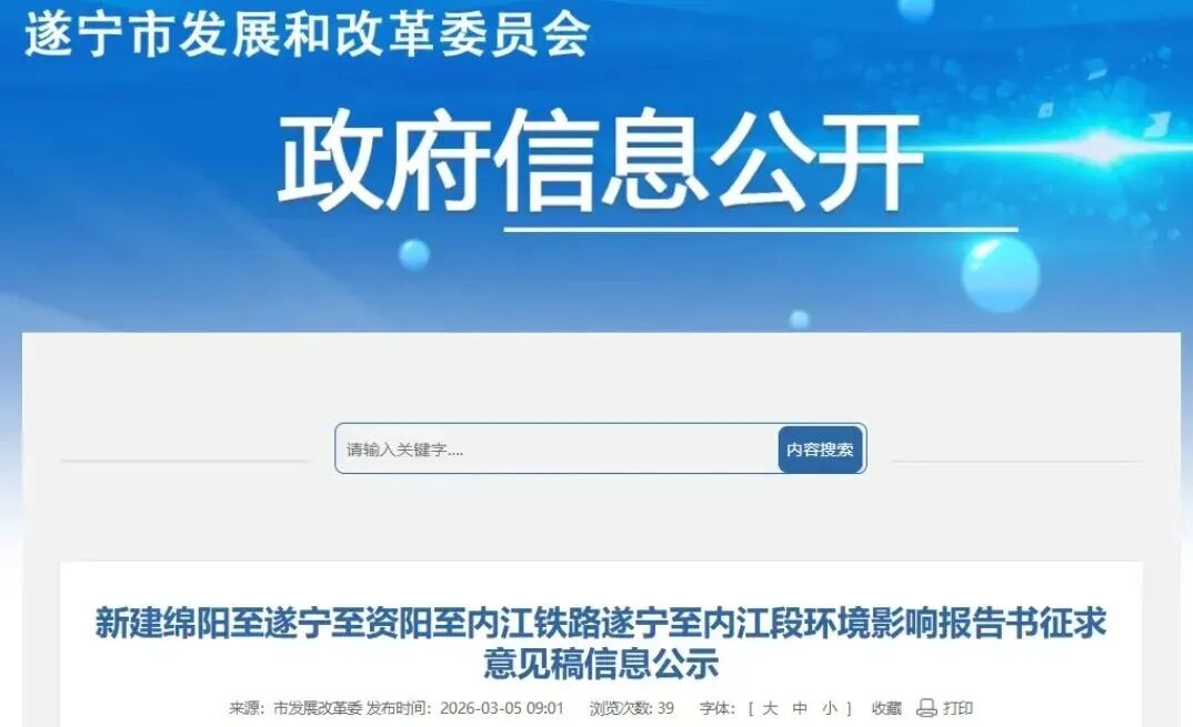 3月5日,新建綿陽至遂寧至資陽至內江鐵路遂寧至內江段環(huán)境影響報告書征求意見稿信息公示正式發(fā)布,項目環(huán)評報告即將上報四川省生態(tài)環(huán)境廳審批,初步設計批復進入倒計時階段,有望在年內正式開工建設。