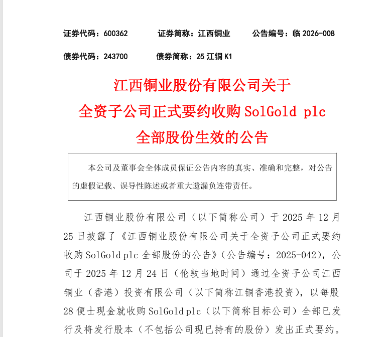 這場(chǎng)備受行業(yè)關(guān)注的跨境并購(gòu),始于2025年12月,前后歷時(shí)3個(gè)月,期間波折不斷。江銅最初通過(guò)全資子公司江西銅業(yè)(香港)投資有限公司發(fā)起收購(gòu)要約,先后兩次以每股26便士的價(jià)格報(bào)價(jià),均被SolGold董事會(huì)拒絕,收購(gòu)進(jìn)程一度陷入停滯。
