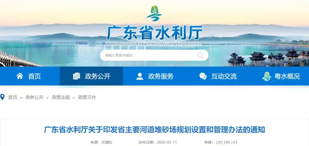 據(jù)了解,《辦法》自2026年5月1日施行,適用于廣東省內(nèi)主要河道管理范圍內(nèi)堆砂場(chǎng)的規(guī)劃、設(shè)置、運(yùn)營(yíng)及監(jiān)管工作,其他河道可參照?qǐng)?zhí)行,核心圍繞堆砂場(chǎng)規(guī)劃編制、禁設(shè)區(qū)域劃定、申報(bào)審批流程、運(yùn)營(yíng)管理規(guī)范、監(jiān)管責(zé)任落實(shí)等方面作出明確規(guī)定,補(bǔ)齊河道堆砂場(chǎng)管理短板,杜絕違規(guī)設(shè)場(chǎng)、無(wú)序堆存、污染環(huán)境等問(wèn)題。
