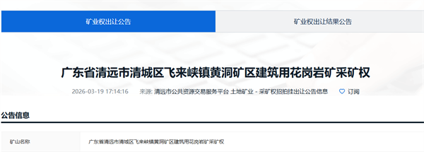 日前,廣東省公共資源交易平臺發(fā)布廣東省清遠市清城區(qū)飛來峽鎮(zhèn)黃洞礦區(qū)建筑用花崗巖礦采礦權掛牌出讓公告。該項目資源儲量5505.87萬方,生產規(guī)模300萬方/年,出讓年限20.9年,掛牌起始價超3.01億元,約5.5元/方。