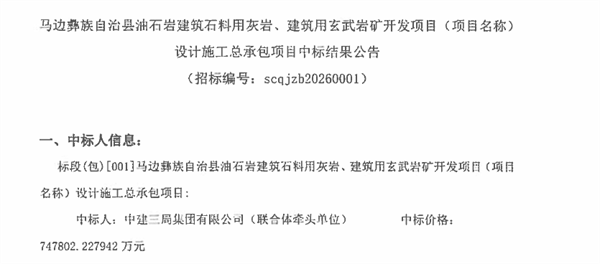 日前,中國招投標(biāo)公共服務(wù)平臺(tái)發(fā)布中標(biāo)公示,四川省樂山市馬邊彝族自治縣油石巖建筑石料用灰?guī)r、建筑用玄武巖礦開發(fā)項(xiàng)目設(shè)計(jì)施工總承包項(xiàng)目正式落定。中建三局以超74.78億元的投標(biāo)報(bào)價(jià)成功中標(biāo)該項(xiàng)目,接下來將全面承擔(dān)這一川渝地區(qū)重點(diǎn)建材礦山項(xiàng)目的全流程建設(shè)與運(yùn)營工作。
