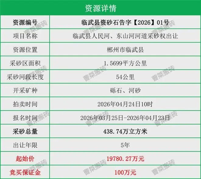 3月25日,湖南省郴州市國(guó)有資產(chǎn)交易平臺(tái)發(fā)布臨武縣人民河、東山河河道采砂權(quán)掛牌出讓公告。此次出讓砂石總儲(chǔ)量438.74萬(wàn)方,起拍總價(jià)超1.97億元。