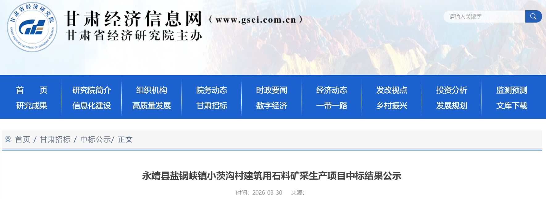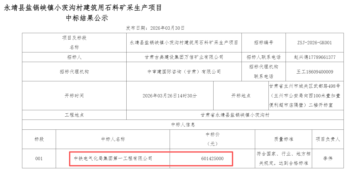 日前,甘肅永靖縣鹽鍋峽鎮(zhèn)小茨溝村建筑用石料礦采生產(chǎn)項目中標(biāo)結(jié)果公示,中鐵電氣化局集團第一工程有限公司以60142.5萬元中標(biāo)該項目。