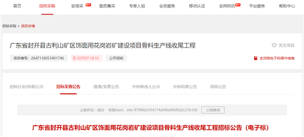 3月26日,中國(guó)招投標(biāo)公共服務(wù)平臺(tái)發(fā)布廣東省封開(kāi)縣古利山礦區(qū)飾面用花崗巖礦建設(shè)項(xiàng)目骨料生產(chǎn)線(xiàn)收尾工程招標(biāo)公告。公告顯示,該收尾工程計(jì)劃于2026年4月開(kāi)工,投標(biāo)截止日期為2026年4月17日。