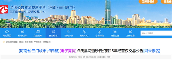 日前,河南三門峽市盧氏縣水利局通過公共資源交易中心發(fā)布公告,將以拍賣方式出讓縣域內30條河道砂石資源15年經(jīng)營權。該項目起拍總價3.42億元,涉及總儲量約3768.3萬方,折算起拍單價約為9元/方,拍賣定于4月21日在線上舉行。