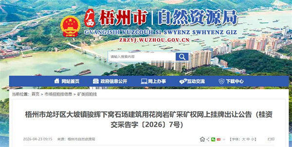 日前,廣西梧州市自然資源局發布龍圩區大坡鎮駿輝下窩石場建筑用花崗巖采礦權網上掛牌出讓公告。該項目資源儲量6084.89萬噸,生產規模300萬噸/年,出讓年限18年,掛牌起始價1.2億元,經估算單價1.97元/噸。