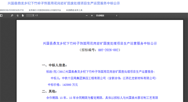 日前,中國招標投標公共服務平臺發布江西省贛州市興國縣鼎龍鄉杞下竹嶺子飾面用花崗巖礦固廢處理項目生產運營服務中標公示信息。中鐵十四局集團第四工程有限公司、江西億宏新材料有限公司聯合體,以14.2億元報價中標該項目。