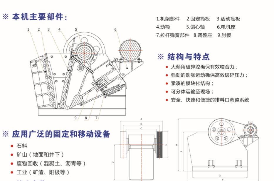 主機(jī)皮帶輪驅(qū)動(dòng)偏心軸,使動(dòng)顎按已定的規(guī)則性運(yùn)動(dòng)軌跡作往復(fù)的上下前后周期性變化的運(yùn)動(dòng),