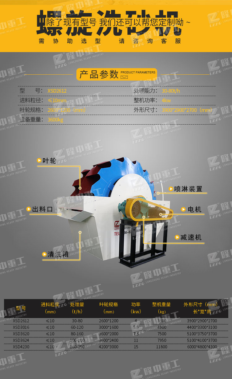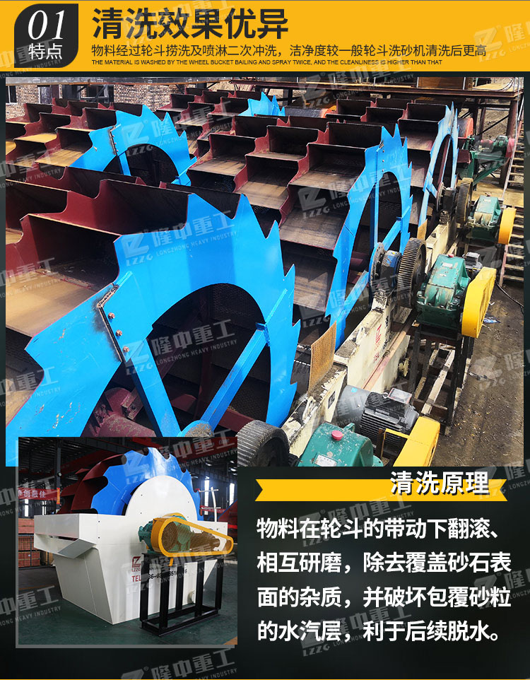 工作時(shí),電機(jī)通過(guò)三角帶、減速機(jī)、齒輪減速后帶動(dòng)葉輪緩慢轉(zhuǎn)動(dòng),砂石有給料槽進(jìn)入洗槽中,在葉輪的帶動(dòng)下翻滾,并互相研磨,除去覆蓋砂石表面的雜質(zhì),同時(shí)破壞包覆砂粒的水汽層,以利于脫水;同時(shí)加水,形成強(qiáng)大水流,及時(shí)將雜質(zhì)及比重小的異物帶走,并從溢出口洗槽排出,完成清洗作用。干凈的砂石由葉片帶走,.后砂石從旋轉(zhuǎn)的葉輪倒入出料槽,完成砂石的清洗作用。