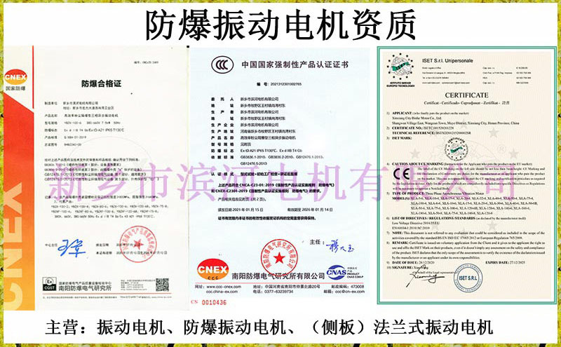 新鄉(xiāng)濱河電機(jī)廠家制造經(jīng)過南陽防爆所檢驗(yàn)合格,放心使用。防護(hù)等級(jí)IP65,是氣體粉塵混合防爆振動(dòng)電機(jī)。