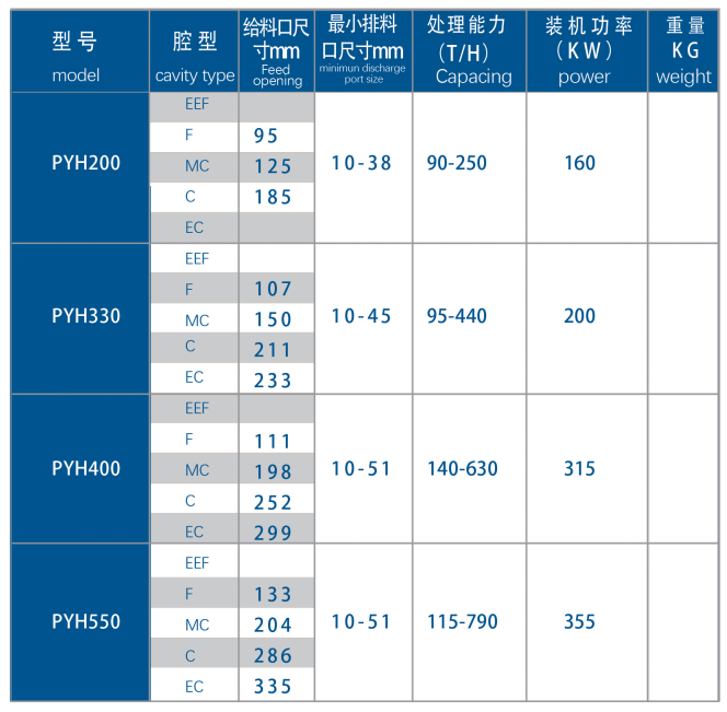 PYH系列圓錐破碎機(jī)只須更換定錐襯板、動(dòng)錐襯板、適配環(huán)和楔形塊緊固螺栓,破碎腔型可從標(biāo)準(zhǔn)超粗腔型到短頭超細(xì)腔型任意變換。