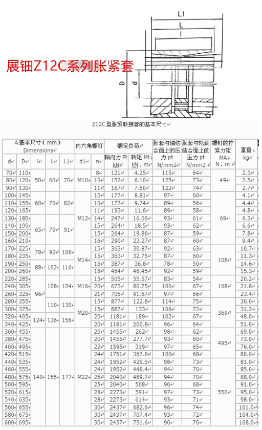 Z12C型系列脹緊套型號(hào)如下:Z12C-70×110、Z12C-80×120、Z12C-90×130、Z12C-100×145、Z12C-110×155、Z12C-120×165、Z12C-130×180、Z12C-140×190、Z12C-150×200、Z12C-160×210、Z12C-170×225、Z12C-180×235、Z12C-190×250、Z12C-200×260、Z12C-220×285、Z12C-240×305、Z12C-260×325、Z12C-280×355、Z12C-300×375、Z12C-320×405、Z12C-340×425、Z12C-360×455、Z12C-380×475、Z12C-400×495、Z12C-420×515、Z12C-440×535、Z12C-460×555、Z12C-480×575、Z12C-500×595、Z12C-520×615、Z12C-540×635、Z12C-560×655、Z12C-580×675、Z12C-600×695。注:Z12C型脹緊聯(lián)結(jié)套螺釘?shù)臋C(jī)械性能等級(jí)為8.8級(jí)。