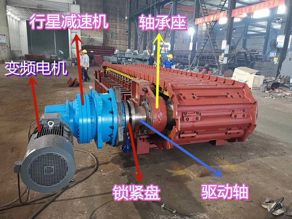 主軸驅(qū)動裝置由1根頭部驅(qū)動軸,2個軸承座,2個驅(qū)動鏈輪,1個鎖緊盤,變頻電機和行星減速機等組成。(見下圖)