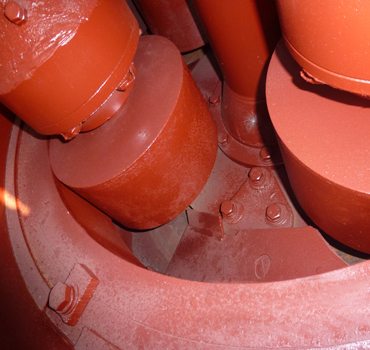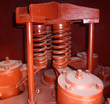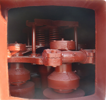 高壓懸輥磨粉機(jī)工作原理與雷蒙磨粉機(jī)相似,但研磨裝置安裝有1000-1500公斤壓力的高壓彈簧。當(dāng)機(jī)器工作時,在高壓彈簧和離心力的作用下,磨輥緊貼于磨環(huán)滾動,其滾動壓力比同等條件下的雷蒙磨粉機(jī)高1.2倍,產(chǎn)量可提高20%-30%;當(dāng)磨輥與磨環(huán)達(dá)到一定磨損后,調(diào)整高壓彈簧長度,保持磨輥與磨環(huán)之間的恒定碾壓力,從而保證穩(wěn)定的產(chǎn)量和細(xì)度。