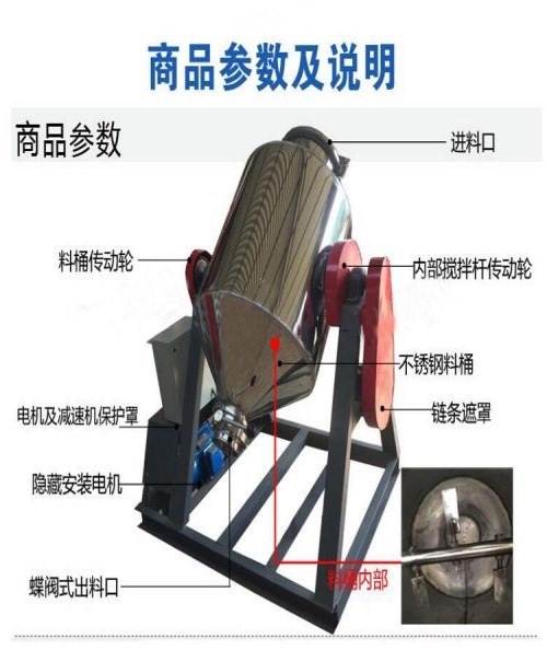 適用范圍:主要用于飼料、化工、農(nóng)藥、燃料、食品、食用鹽、中藥粉、 糖類、面粉、各行業(yè)的粉體添加劑和微量元素的混合,干凈衛(wèi)生不氧化。密封性好,變速箱,齒輪帶動 倒料方便,可以360度旋轉(zhuǎn)。