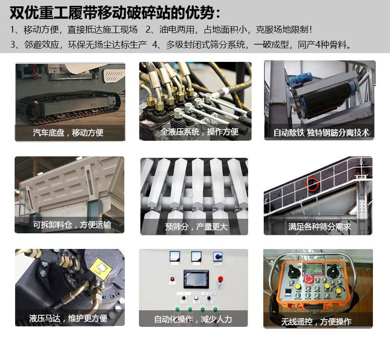 鄭州雙優(yōu)重工生產(chǎn)的時(shí)產(chǎn)200噸履帶式移動(dòng)破碎機(jī)無(wú)場(chǎng)地限制要求,非常適用于具有搬家性質(zhì)需求的建筑場(chǎng)地。履帶行走模式,作業(yè)直接有效,不僅節(jié)省了物料運(yùn)輸?shù)馁M(fèi)用,也避免了二次運(yùn)輸所產(chǎn)生的粉塵污染。