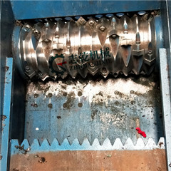 物料通過(guò)進(jìn)料系統(tǒng)進(jìn)入撕碎箱體內(nèi)部,箱體上承載有撕碎刀片,推料箱將物料推至刀片附近,物料經(jīng)過(guò)撕碎刀片撕扯、擠壓、剪切等綜合作用,撕碎成小塊的物料,從篩網(wǎng)孔中排出。