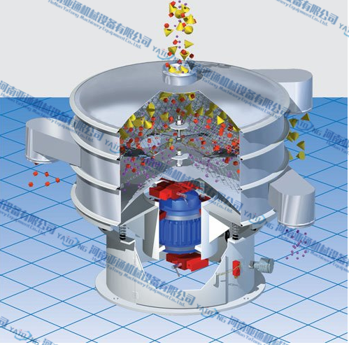 旋振篩是由底座的普通電機(jī),通過(guò)橡膠聯(lián)軸器,帶動(dòng)激振器、激振器的上下兩端裝有偏心重錘,將電機(jī)的旋轉(zhuǎn)運(yùn)動(dòng)變?yōu)榇怪薄⑺?、傾斜的三次元運(yùn)動(dòng),再把運(yùn)動(dòng)傳遞給篩面,調(diào)節(jié)上下兩端偏心重錘的相位角來(lái)改變物料在篩面上的運(yùn)動(dòng)軌跡。
