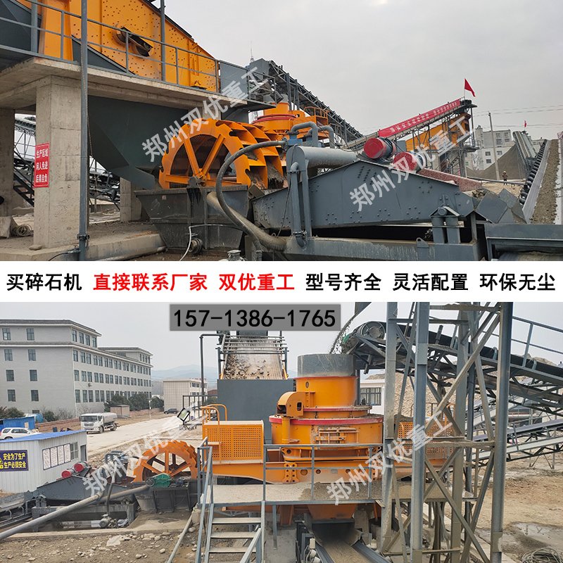 1.顎式破碎機+圓錐式破碎機+制砂機+輔助設(shè)備(給料機、輸送機、提升機等);