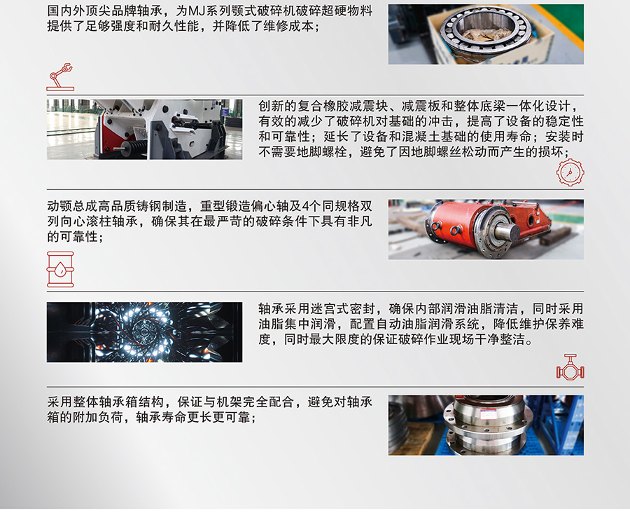 除了在工藝上進(jìn)行優(yōu)化和升級(jí)外,國內(nèi)外品牌配件、軸承和電機(jī)為MJ系列顎式破碎機(jī)破碎超硬物料提供了足夠強(qiáng)度和耐久性能,并降低了維修成本。