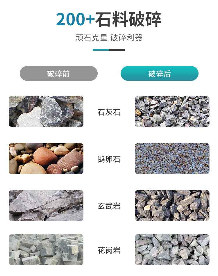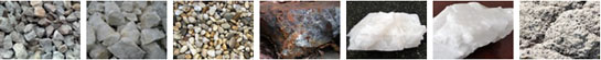河卵石、花崗巖、玄武巖、鐵礦石、石灰石、石英石、輝綠巖、建筑垃圾、鐵礦、金礦等