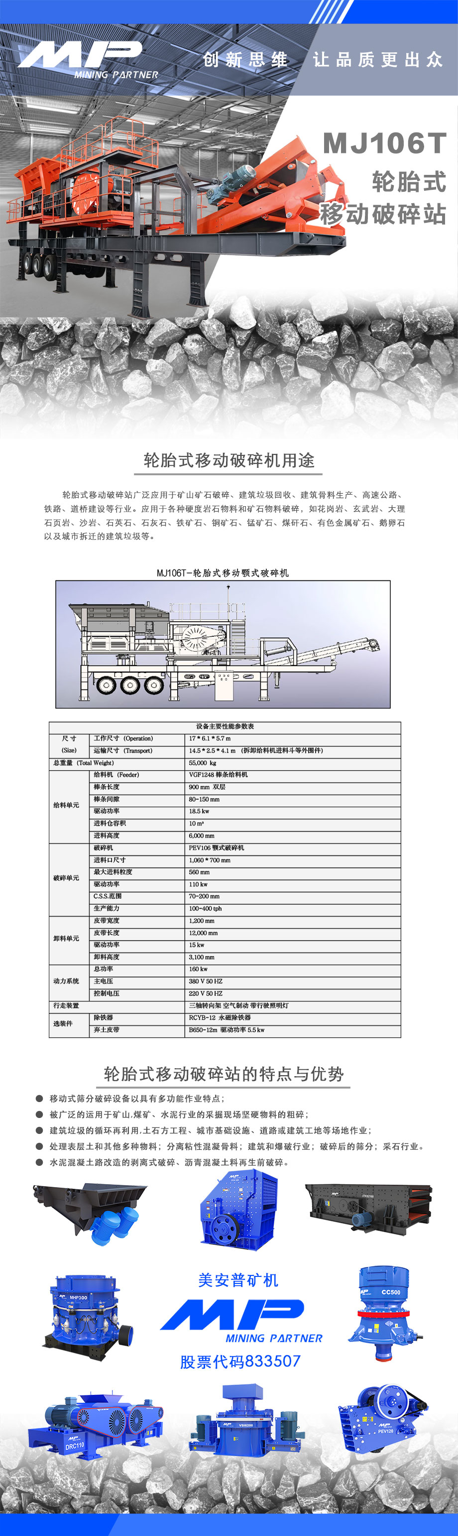 | 您當(dāng)前位置:首頁(yè) >> 產(chǎn)品庫(kù) >> 移動(dòng)破碎站 >> MJ106T輪胎式移動(dòng)破碎站鵝卵石花崗巖河卵石碎石機(jī)鄂破圓錐 |