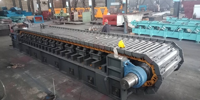 鏈板組件直接承受礦倉物料壓力和運送物料。鏈板組件由輸送板、牽引鏈軌及其聯(lián)接螺栓組成。輸送板采用搭接式結(jié)構(gòu)。輸送板材質(zhì)為高錳鋼,鑄造成型,相互搭接,輸送板用螺栓固定在鏈軌上。這種板不僅重量輕、不漏礦,而且強度高、耐磨損、抗沖擊。