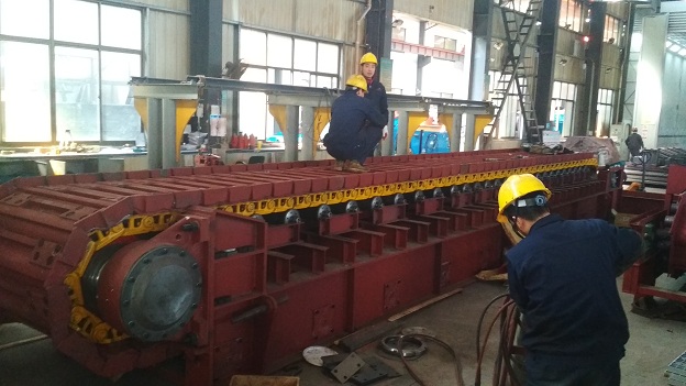 張緊裝置既是鏈板組件的張緊組件,又是改向軸組件的支承組件。它主要由座架及滑動支承座組成,后部設能帶動滑動支承座前后移動的調(diào)節(jié)桿,可對滑動支承座前后調(diào)節(jié),以保持鏈軌合適的張緊度。