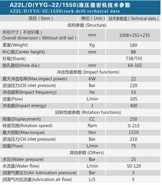 最大沖擊功率:22 KW 鑿孔直徑:64-102 mm 流量:105 L/min   沖擊能:400J