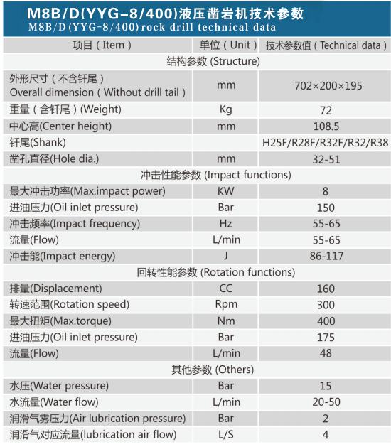 最大沖擊功率:8W 鑿孔直徑:32-51mm 流量:55-65 L/min
