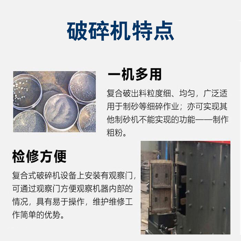 復(fù)合式破碎機(jī)簡(jiǎn)稱為復(fù)合破,是破碎生產(chǎn)線和制砂生產(chǎn)線中常用設(shè)備之一。復(fù)合破碎機(jī)是一種無篩條、可調(diào)式細(xì)碎設(shè)備,可廣泛適用于水泥廠的生料、熟料細(xì)碎作業(yè),同時(shí)也可用于白云石、焦寶石、鉛鋅礦、蛇紋石、高爐渣、煤矸石、磷礦石等中等硬度物料的細(xì)碎作業(yè),特別適用于硬質(zhì)石灰?guī)r、白云巖、花崗巖、玄武巖等人工造砂或高速公路路面石料的加工破碎。