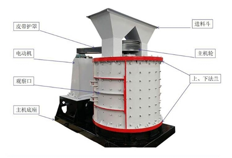 復(fù)合式破碎機(jī)全機(jī)由傳動裝置、主軸、筒體、上蓋及底座等部分組成,電動機(jī)經(jīng)梯形三角帶帶動主軸旋轉(zhuǎn),主軸上裝有錘頭,物料從上部給料口進(jìn)入機(jī)內(nèi),并靠重力下落,物料連續(xù)受到高速旋轉(zhuǎn)的錘頭的一系列沖擊而被破碎,然后從下部排料口卸出。