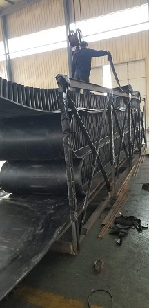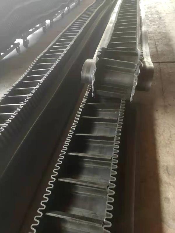 大傾角裙邊隔板帶, 是由基帶、擋邊、橫隔板3部分組成。擋邊起防止物料測(cè)滑撒落的作用。為便于繞過(guò)滾筒,檔邊設(shè)計(jì)成波紋狀;橫隔板的作用是承托物料,為了實(shí)現(xiàn)大傾角輸送,采用T型TC型。檔邊和橫隔板是用二次硫化的方法與基帶連接的,具有很高的連接強(qiáng)度。用于輸送易散落的粉狀、粒狀、小塊狀、糊狀及液態(tài)狀物料。其特點(diǎn):適用于傾角0°~90°散裝物料的輸送;具有使用范圍廣、占地面積小、無(wú)轉(zhuǎn)運(yùn)點(diǎn)、減少土建投資、維護(hù)費(fèi)用低、維修容易輸送量大連續(xù)化、高效率、大傾角運(yùn)輸,操作安全,使用簡(jiǎn)便,,運(yùn)費(fèi)低廉,并能縮短運(yùn)輸距離,降低工程造價(jià),節(jié)省人力物力等特點(diǎn);解決了普通帶和花紋帶所不能達(dá)到的輸送角度;還可根據(jù)使用環(huán)境,設(shè)計(jì)成完整、獨(dú)立的輸送系統(tǒng),避免了間斷輸送和復(fù)雜輸送的提升系統(tǒng)。可沿水平、傾斜、垂直和變角方向輸送各種散裝物料,從煤、礦石、沙子到化肥和糧食等。物料粒度不限,可從很小的粒度到400mm的大粒度,輸送量可從1立方米/小時(shí)到6000立方米/小時(shí)。