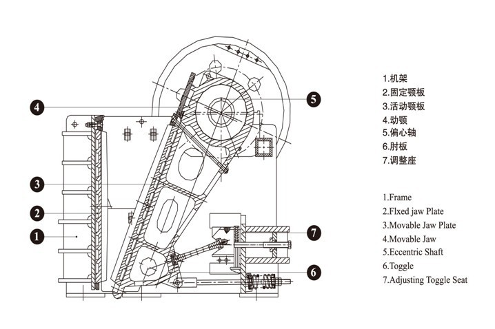 具體來(lái)說(shuō),大型顎式破碎機(jī)的主要工作原理是利用兩塊顎板(動(dòng)顎和定顎)的相對(duì)運(yùn)動(dòng)來(lái)擠壓和破碎物料。物料進(jìn)入破碎腔后,受到動(dòng)顎的擠壓和剪切作用,逐漸被破碎成較小的顆粒,并通過(guò)出料口排出。