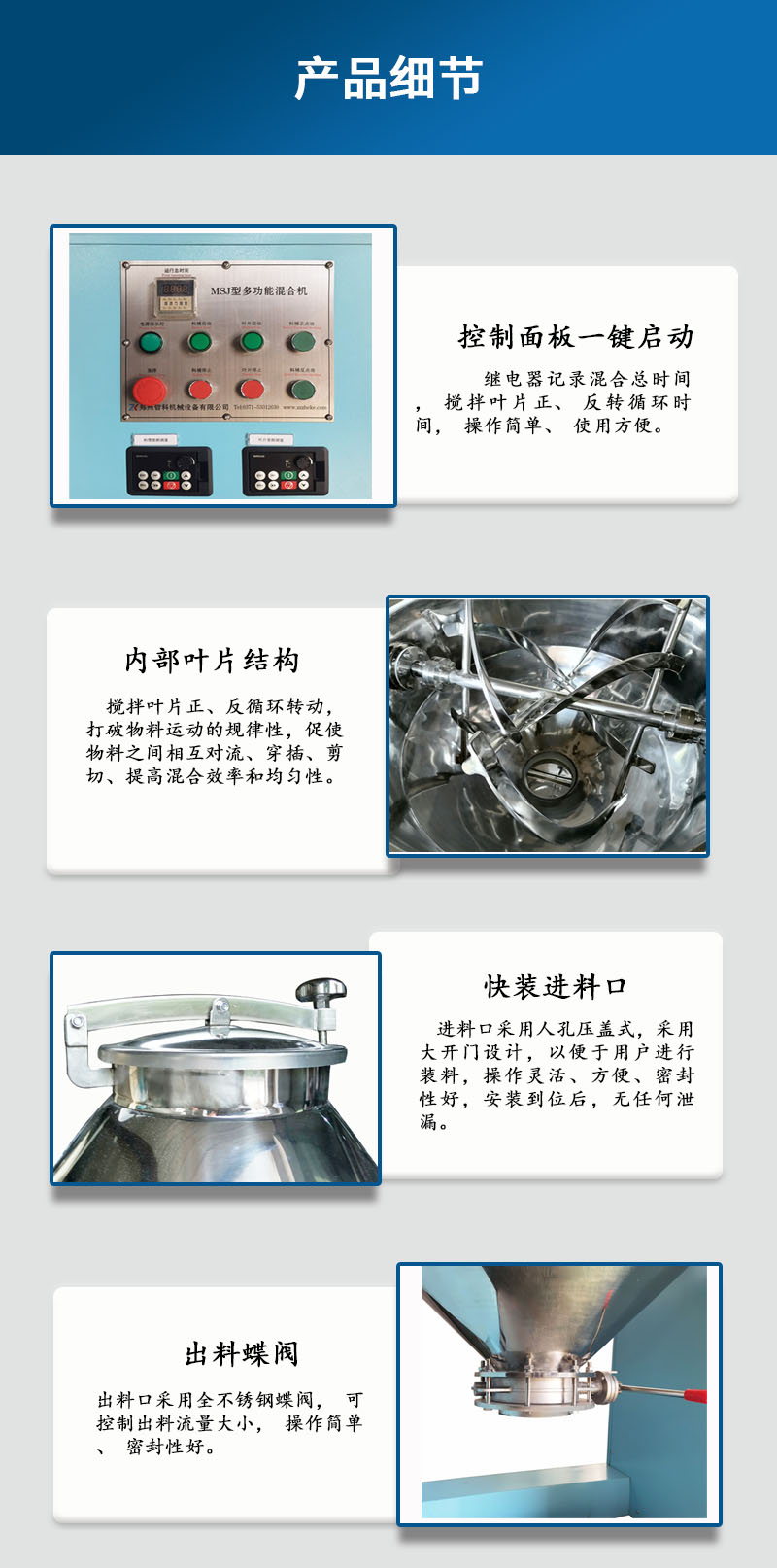 3. 料桶有效裝載率達(dá)到80%,混合時(shí)間短、效率高(傳統(tǒng)混合機(jī)裝載率40%)。