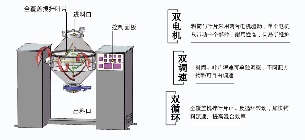1、結(jié)合傳統(tǒng)混合機的空間對倒與強制攪拌混合工藝于一體,混合效率更高。