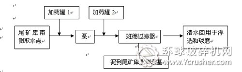 本方案使用公司的專利產(chǎn)品班德過濾器作為尾礦水處理的主要裝置。我們以如下工藝流程示意圖進行說明: