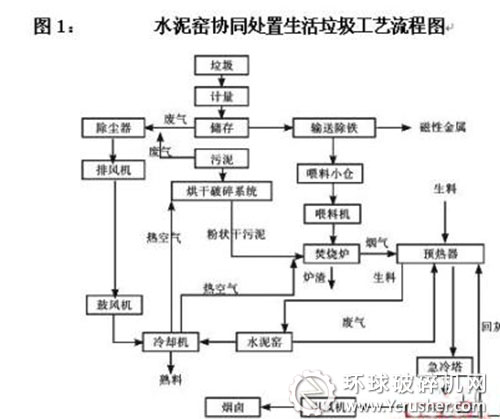 喂料機(jī)把垃圾均勻地喂入回轉(zhuǎn)式焚燒爐,利用熟料冷卻機(jī)的熱風(fēng)作為燃燒空氣,垃圾在熱風(fēng)的作用下焚燒,焚燒產(chǎn)生的高溫?zé)煔猓?100℃左右)進(jìn)入窯尾分解爐和預(yù)熱器,與水泥生料換熱,為水泥生料分解提供熱量,然后由窯尾廢氣處理系統(tǒng)凈化后排放。垃圾焚燒灰渣直接進(jìn)入回轉(zhuǎn)窯作為水泥原料或從焚燒爐排出作為水泥混合材使用。水泥窯協(xié)同處置生活垃圾工藝流程如圖1: