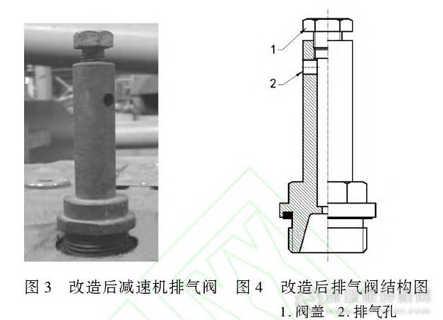 (3)將閥蓋改為螺紋連接當排氣閥堵塞時,可卸下排氣閥,擰下閥蓋進行徹底清洗。為了減少排氣閥堵塞現(xiàn)象的發(fā)生,可定期對排氣進行拆卸清洗。圖3改造后減速機排氣閥圖