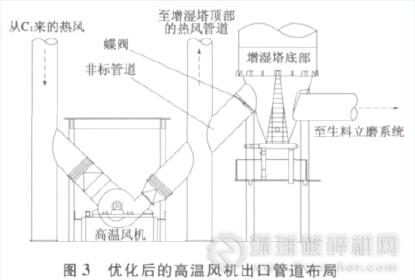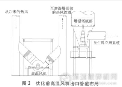 我公司窯尾配備有余熱發(fā)電系統(tǒng), 由C1排出的廢氣溫度約320℃,經余熱發(fā)電利用后 ,廢氣溫度約為200℃。 在正常生產時,窯尾廢氣經余熱發(fā)電、高溫風機后進入增濕塔進行沉降,然后為生料立磨系統(tǒng)提供熱風或者直接經窯尾收塵后排向大氣。由于余熱發(fā)電投入運行后,增濕塔入口氣體溫度不高,增濕塔一般未投入運行,但是廢氣卻同樣需要被輸送到增濕塔頂部,窯尾風機做功增加。 優(yōu)化改造前的高溫風機出口管道布局見圖2。