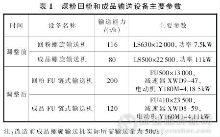 針對以上情況并結合現(xiàn)場設備布局,公司決定將成品和回粉螺旋輸送機改造成FU 鏈式輸送機。 增加輔機設備的輸送能力和對物料顆粒變化的適應性,同時降低鏈速,使得進入FU 鏈式輸送機的煤粉形成一定厚度的料層,防止和降低了鏈條與軌道、煤粉之間以及鏈條與鏈條之間摩擦產生靜電而引發(fā)安全事故的幾率。 優(yōu)化調整前后,回粉和成品輸送設備主要參數(shù)見表1。